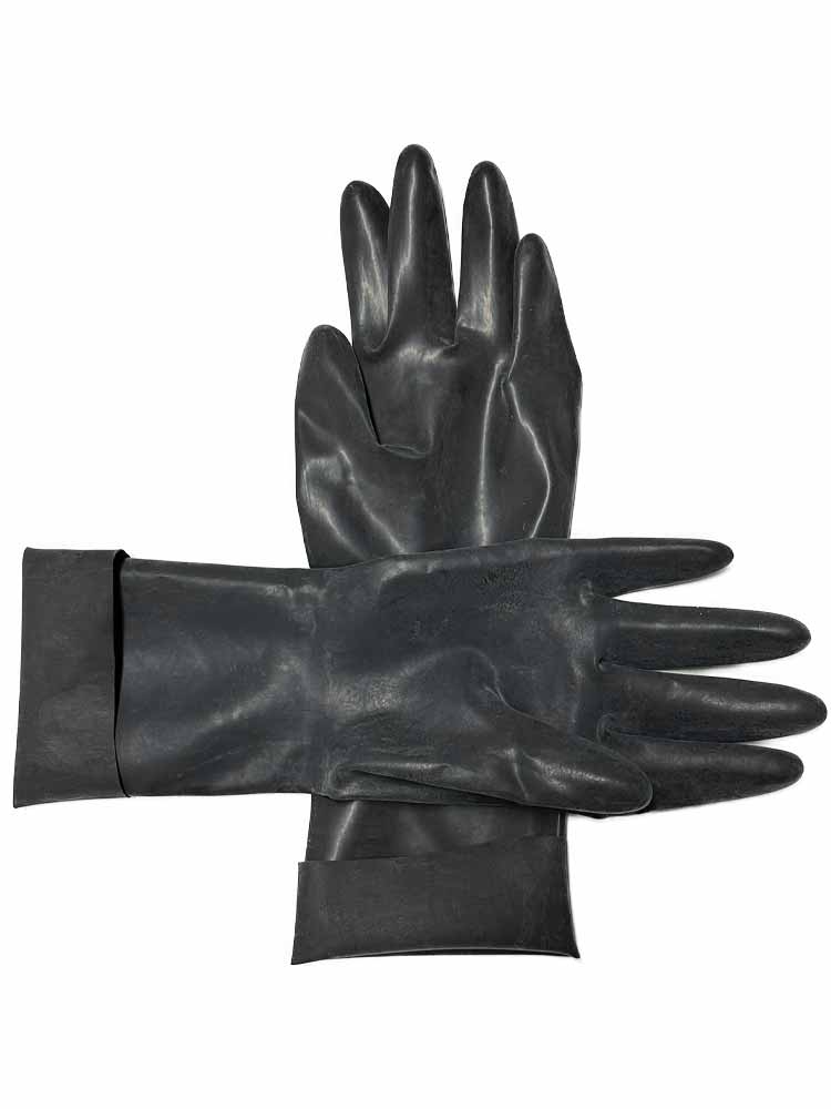 Mittellange Gummihandschuhe aus geilem, glattem, ca. 0,5 mm starkem Latex.