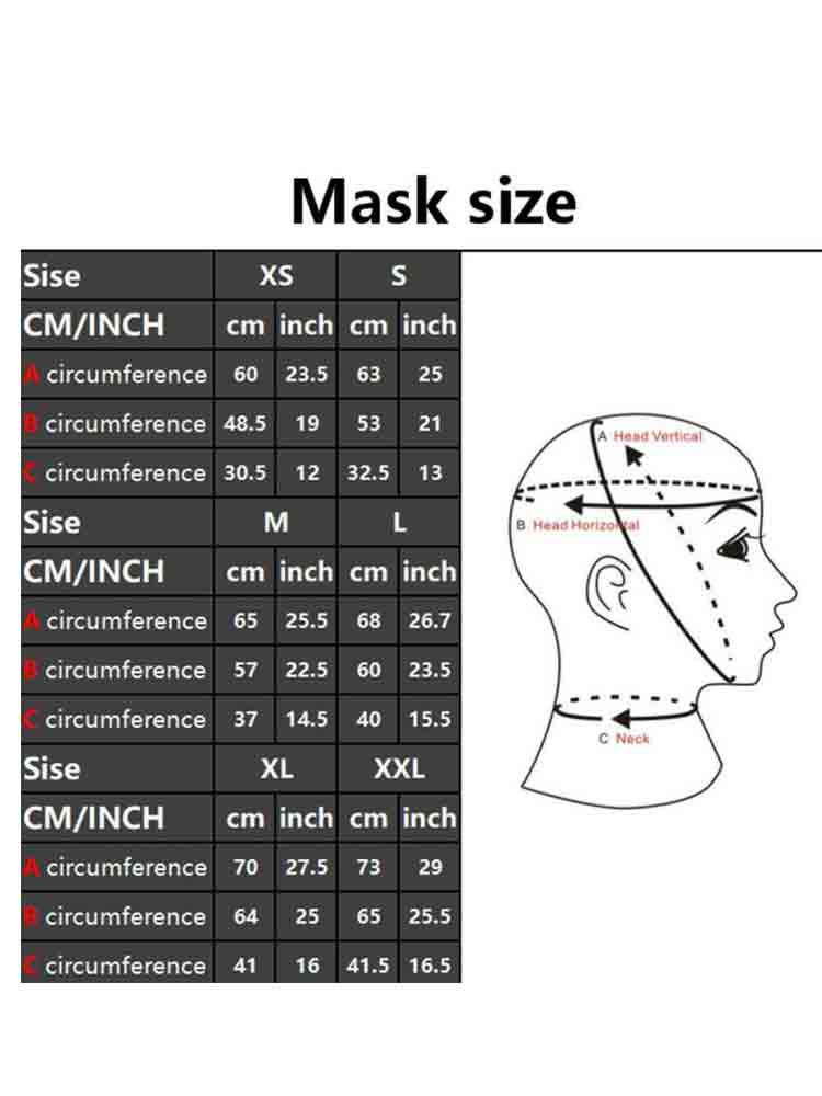 Die Kopfmaske verfügt rückseitig über einen unterlegten Reißverschluss. Der vordere Teil ist weich und ermöglicht es, einen Fuß hineinzustecken. Details siehe Abbildungen.