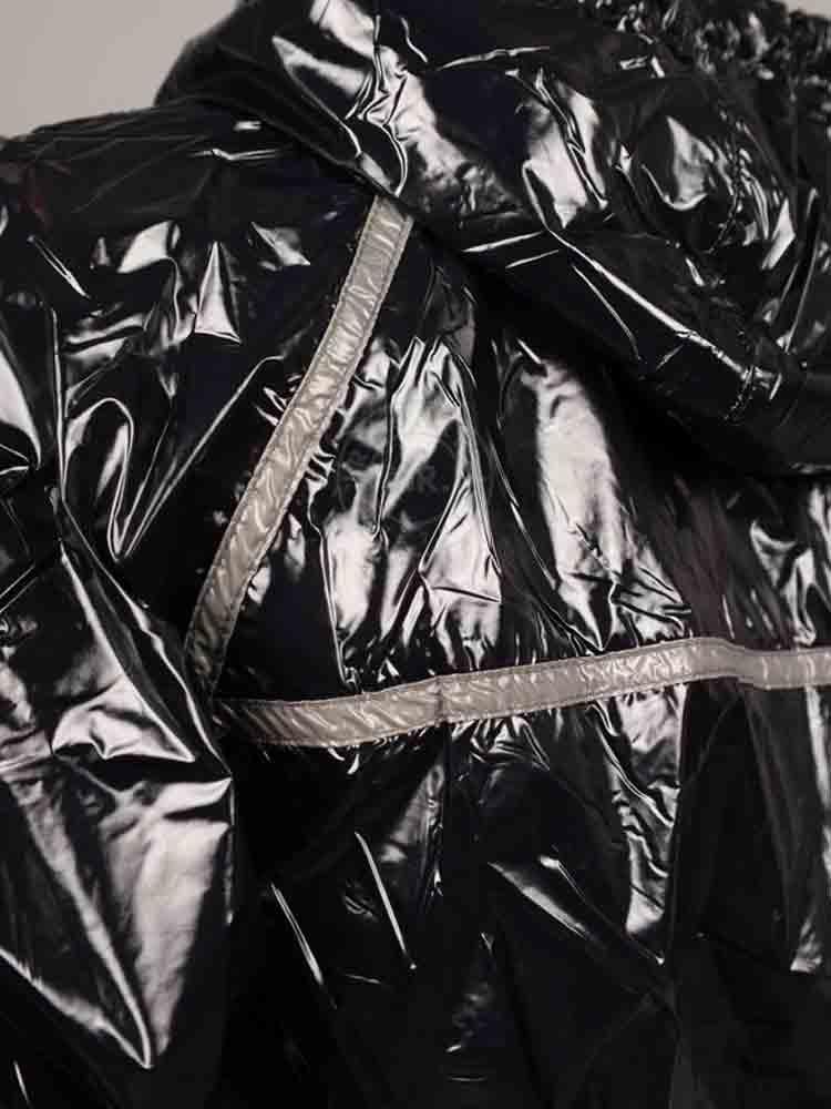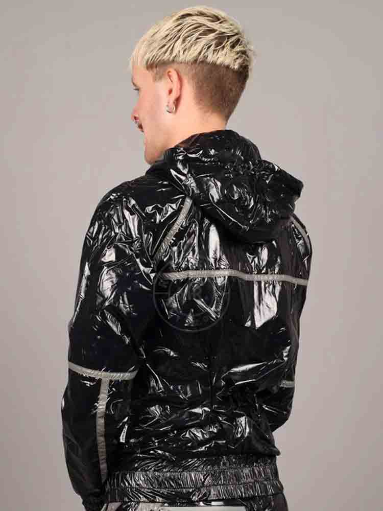 Schwarze, glänzende Nylon-Trainingsjacke mit grauen Nylon-Einsätzen.