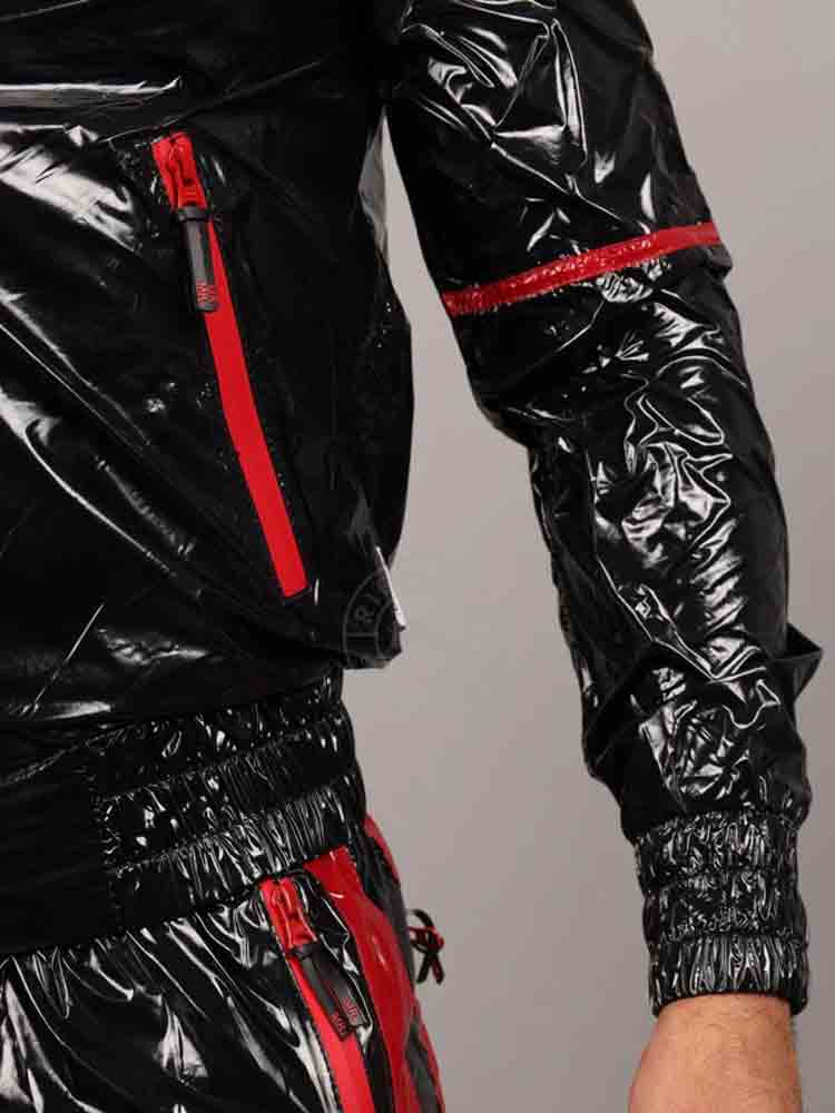 Schwarze, glänzende Nylon-Trainingsjacke mit roten Nylon-Einsätzen.