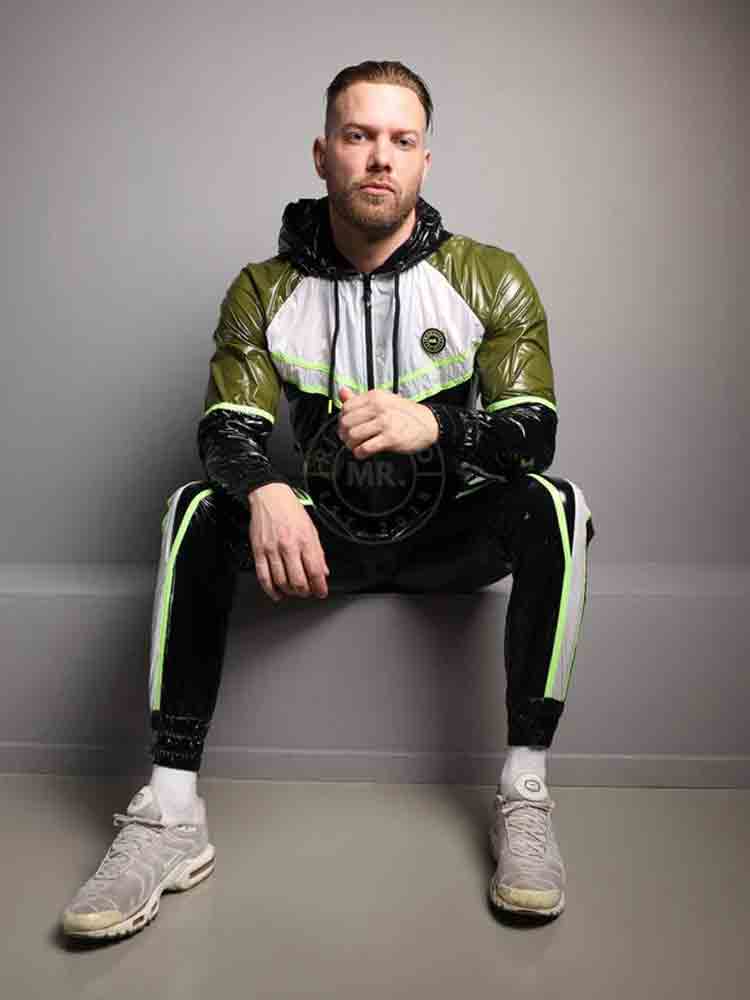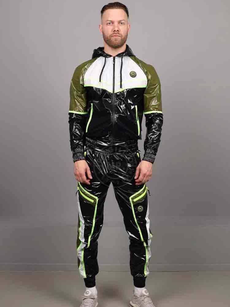 Lerne die Trainingshose FUNIS kennen, den Star unter den Trainingsanzügen – eine auffällige Mischung aus Schwarz und Armeegrün, gekrönt von einem strahlend weißen Brusteinsatz und durchzogen von neongrünen Streifen, die praktisch vor Energie pulsieren. Es ist Militär-Clubwear mit einem verspielten, versauten Touch.