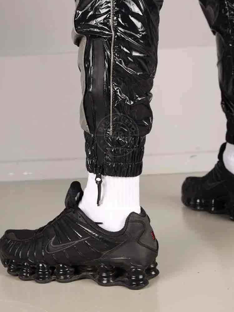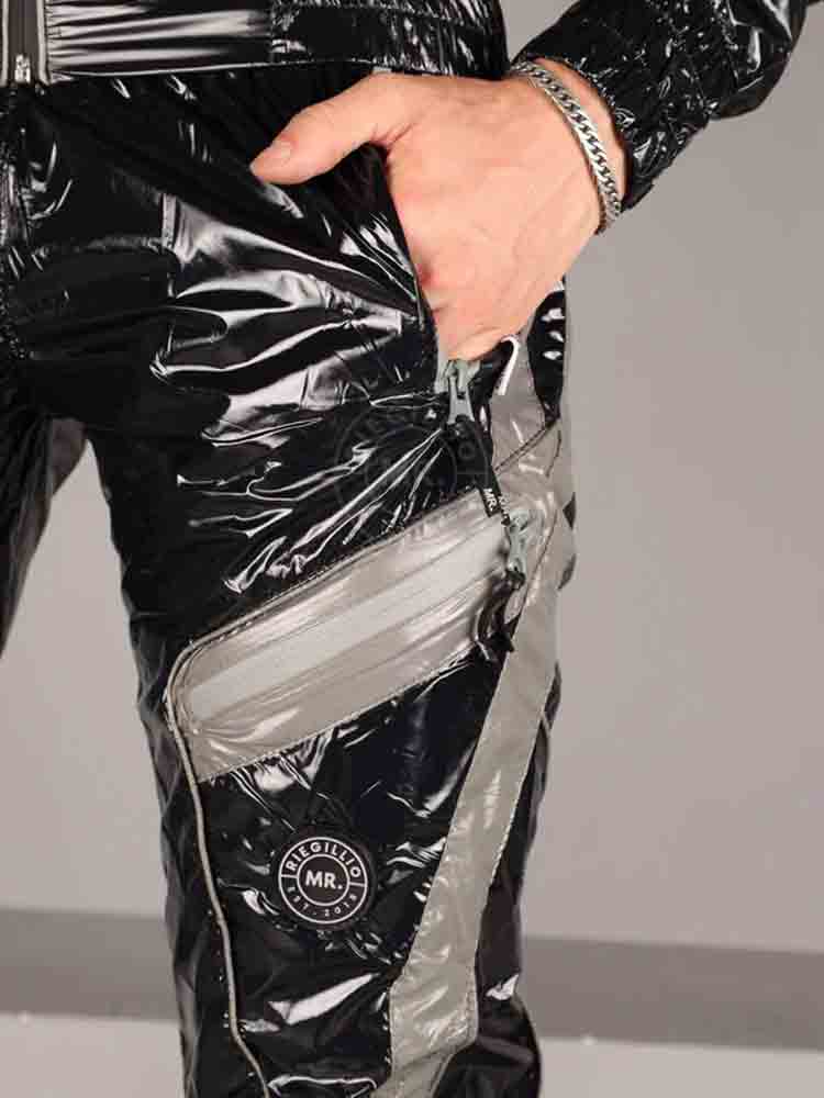 Glänzende schwarze Nylon-Trainingshose mit grauen Akzenten