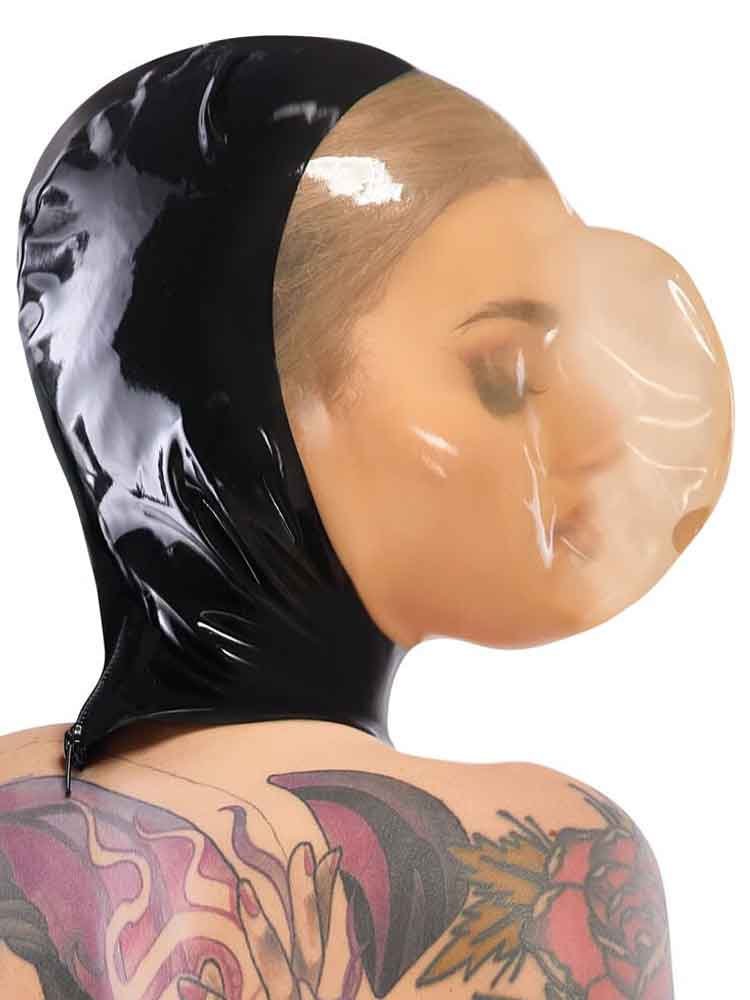 Hochwertig geklebte Vakuum-Maske mit erweitertem Gesichtsfeld. Lediglich ein kleines Atemloch ermöglicht hier die Luftzufuhr. Mit Reißverschluss am Hinterkopf.