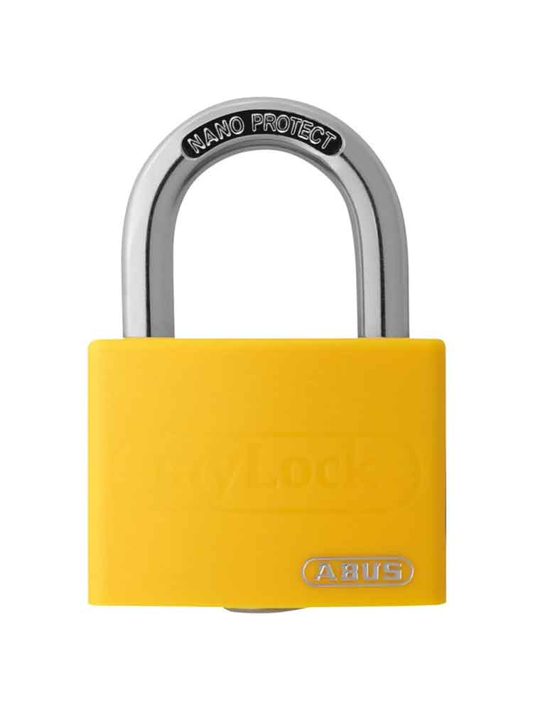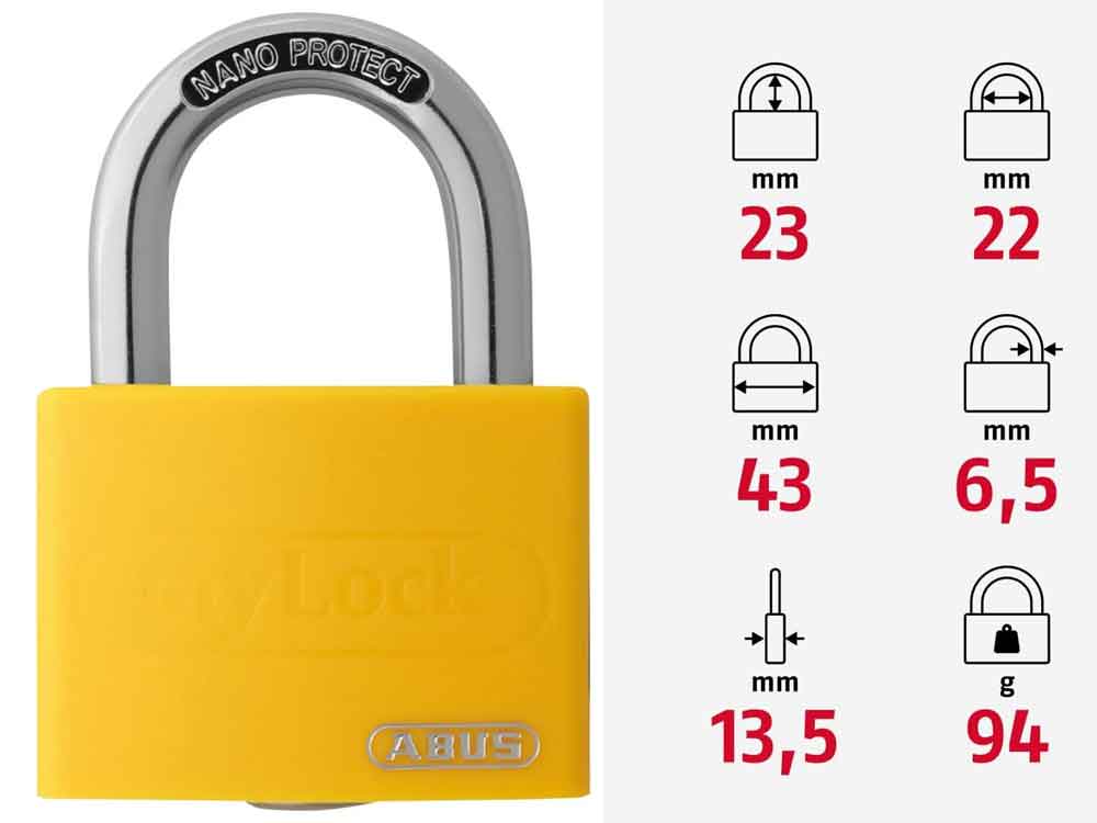 Das dazugehörige Bügelschloss von ABUS, aus der Serie myLock ist kunststoffbeschichtet und lässt sich ggf. auf einer der Seiten beschriften – siehe Abbildung. Damit bestens geeignet, um Dich einem Master, Sir, Herrn, Handler, zu unterwerfen oder zuordnen zu lassen.