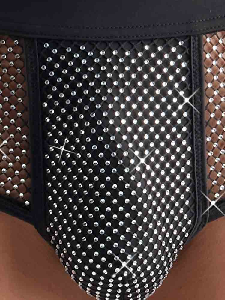 Der blickdichte Beutel und die Netz-Einsätze vorn sind über und über mit Glitzersteinchen besetzt.