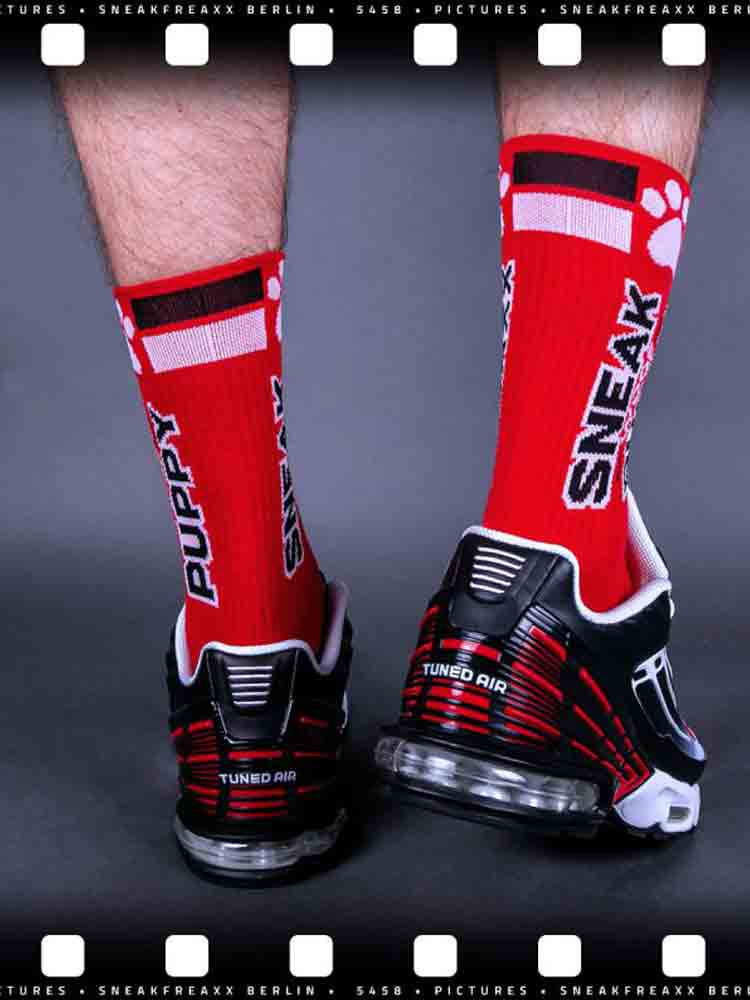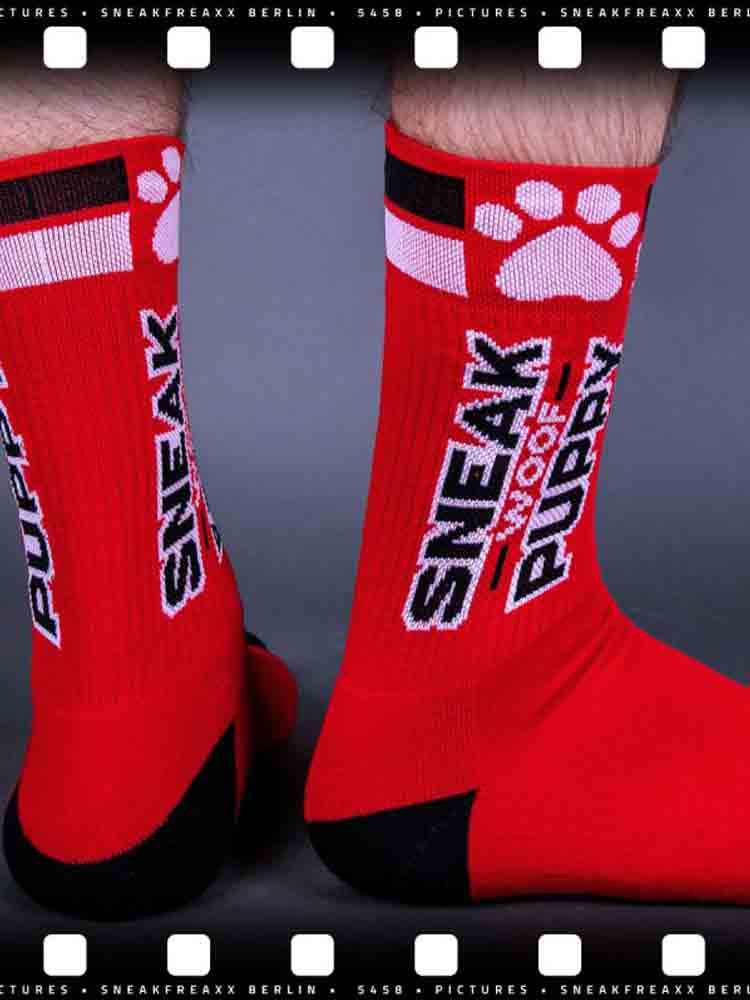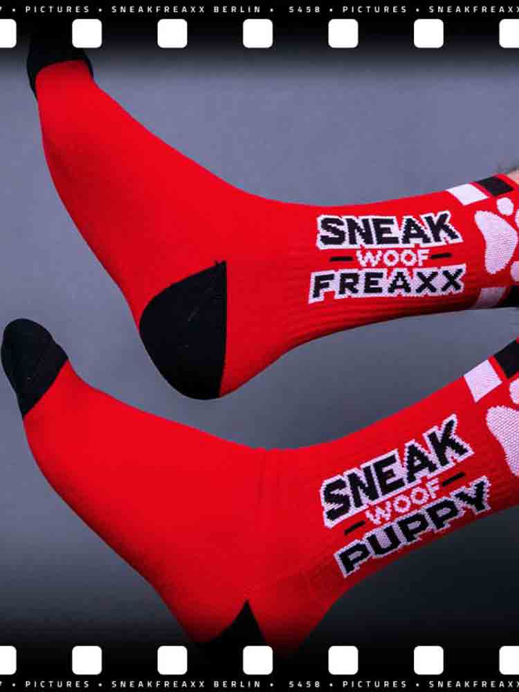 Rote geile Socken mit EINGEWEBTEM schwarz-weißem "SNEAK - WOOF - PUPPY" LOGO auf der einen Seite UND "SNEAK - WOOF - FREAXX" LOGO auf der anderen Seite.
