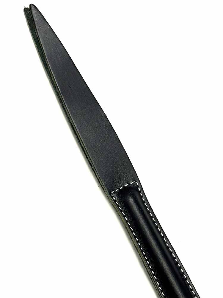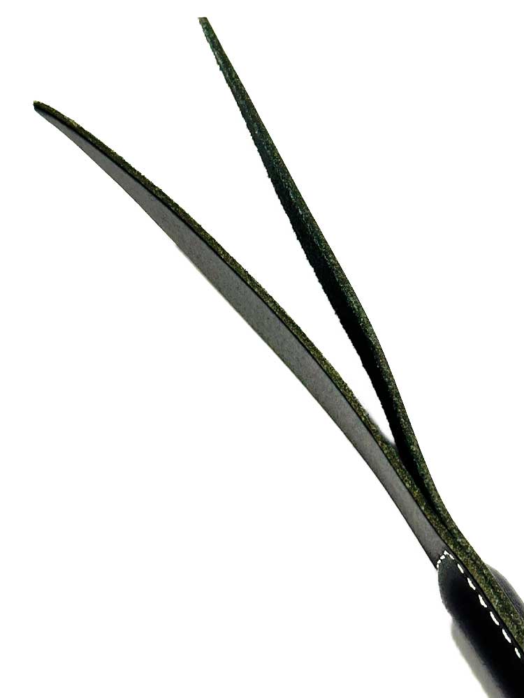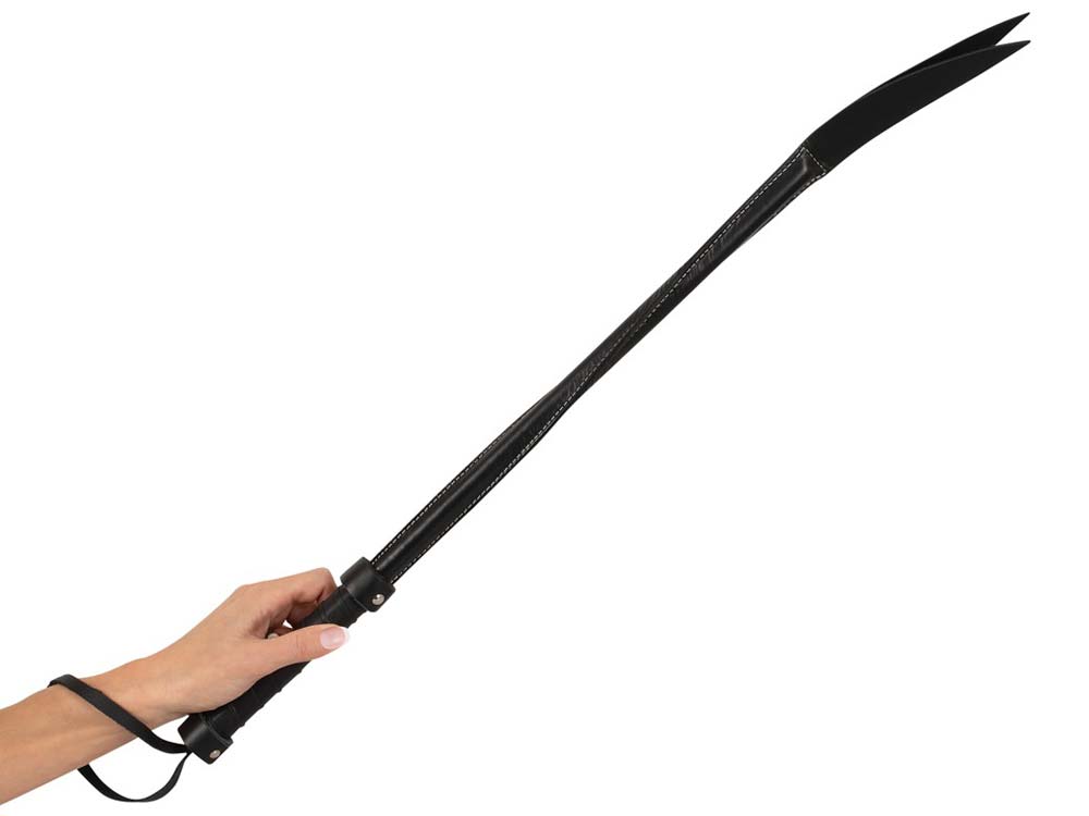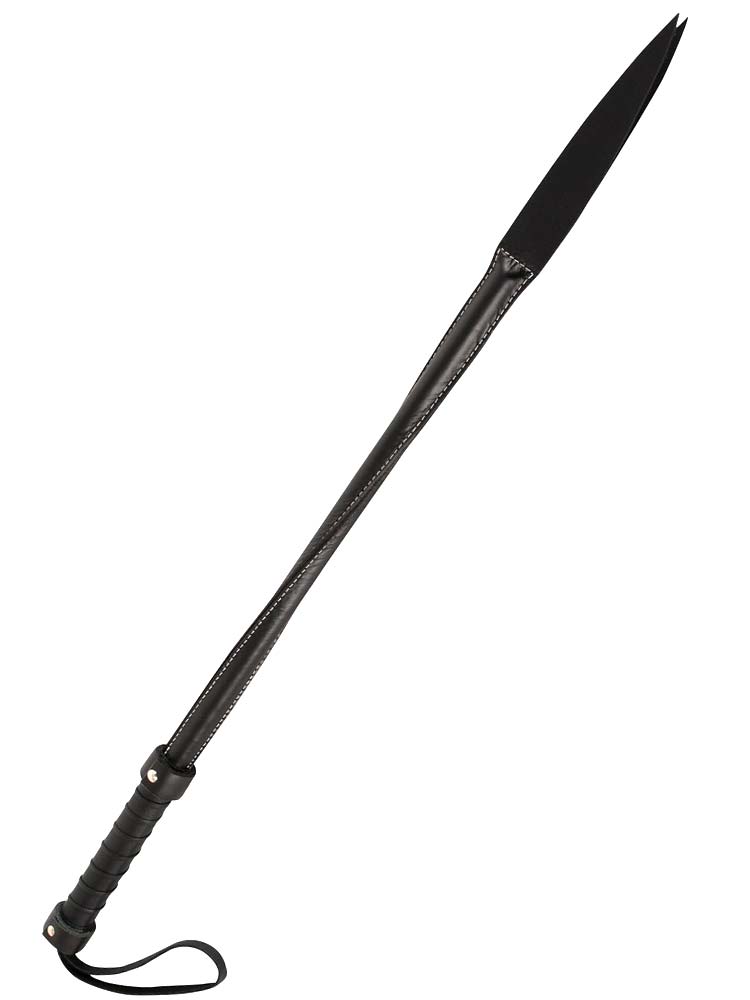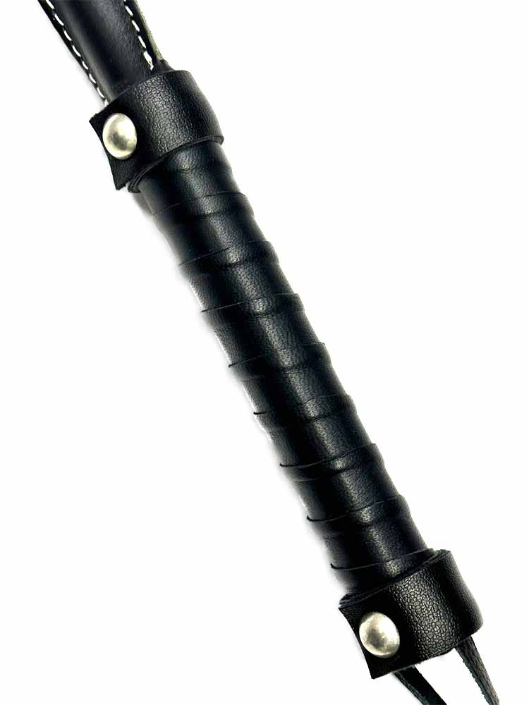 Die in sich gedrehte Ledergerte eignet sich perfekt fürs präzise Schlagen, wobei die doppelte Schlagspitze wunderbar geräuschvoll zischt und klatscht.