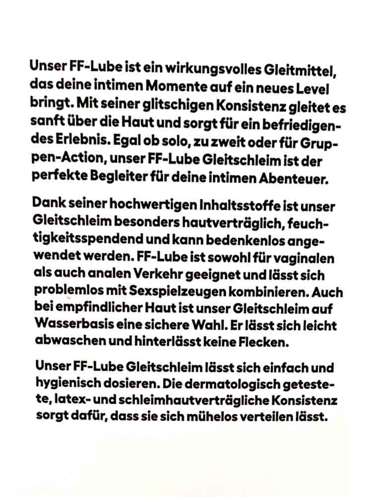 Unser FF LUBE ist ein wirkungsvolles Gleitmittel, das Deine intimen Momente auf ein neues Level bringt. Mit seiner glitschigen Konsistenz gleitet es sanft über die Haut und sorgt für ein befriedigendes Erlebnis. Ideal auch für Kliniksex und Prostataplay.