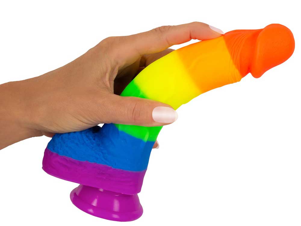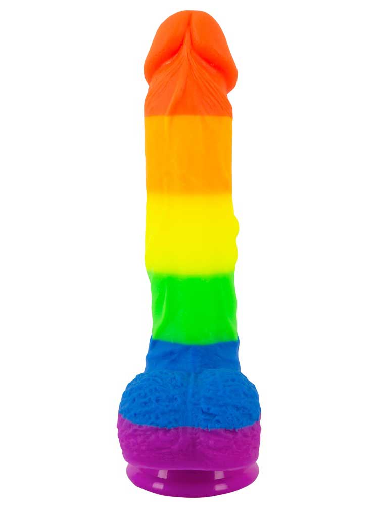 Stolzer Regenbogen-bunter Silikon-PRIDE-Dildo im detaillierten Penislook mit ausgeprägter Äderung und prall ausgeformter Eichel.