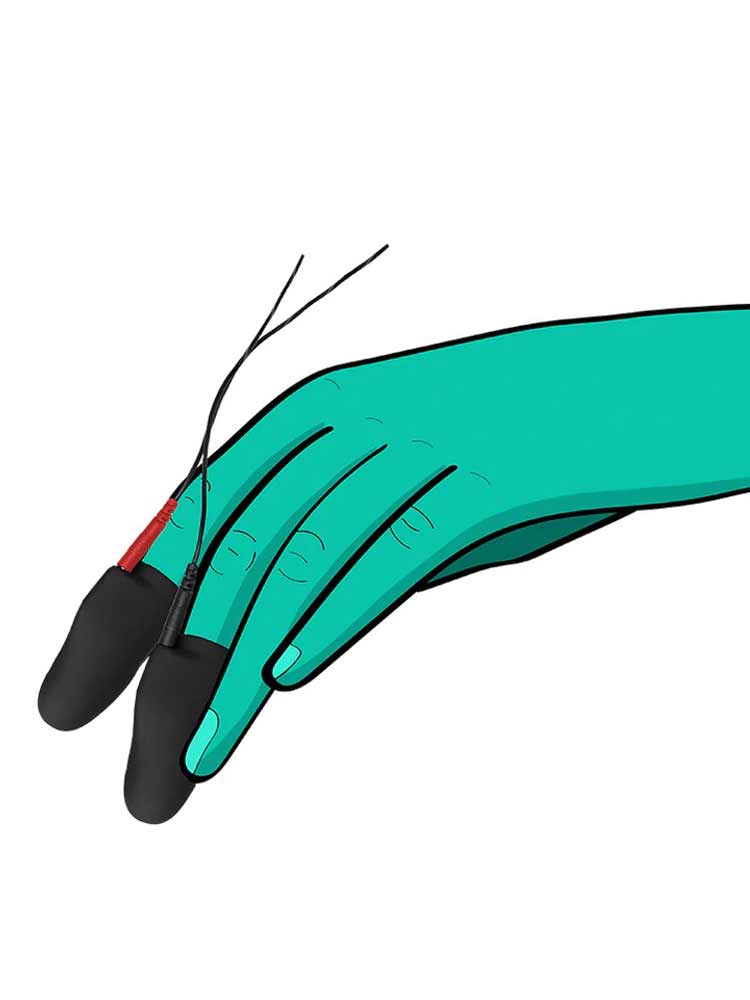 Die leitfähigen Fingermanschetten bestehen aus platinvernetztem Silikon (100 % phthalatfrei) und können als Paar getragen oder mit einem anderen unipolaren Spielzeug wie einem Pad, einem Penisring oder einer Harnröhrensonde kombiniert werden, um eine Reihe unterschiedlicher Empfindungen zu erzielen.