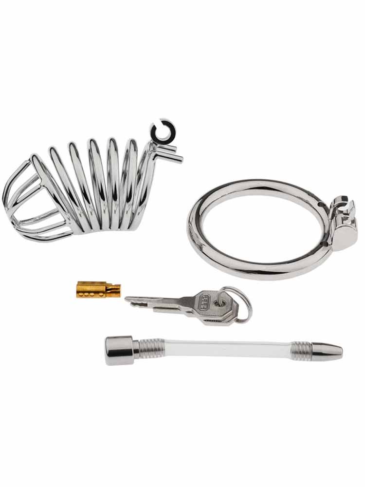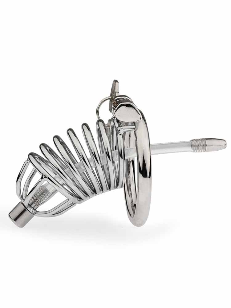 Dieser Vollmetall-Peniskäfig verfügt zusätzlich über einen flexiblen Harnröhrenstab, der wahlweise montiert und eingeführt werden kann.