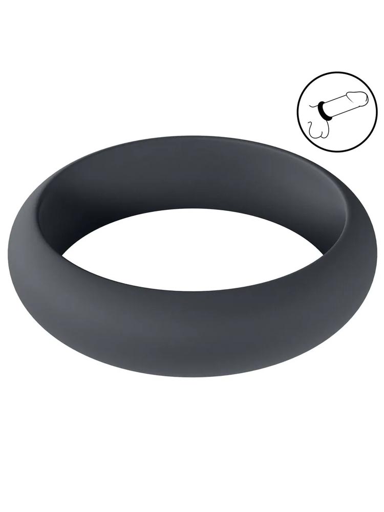 Schwarzer, etwas dehnbarer Cockring aus Silikon. Einfach an- und abzunehmen, auch bei einer Erektion.